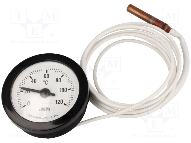 Telethermometer CP 05 case Ø52 mm, black body with plastic frame. Capillary 1500mm, Ø2,4 mm, PVC coated. Temperature range 0+120°C, white dial with black numbers, free bulb Ø 6 mm.